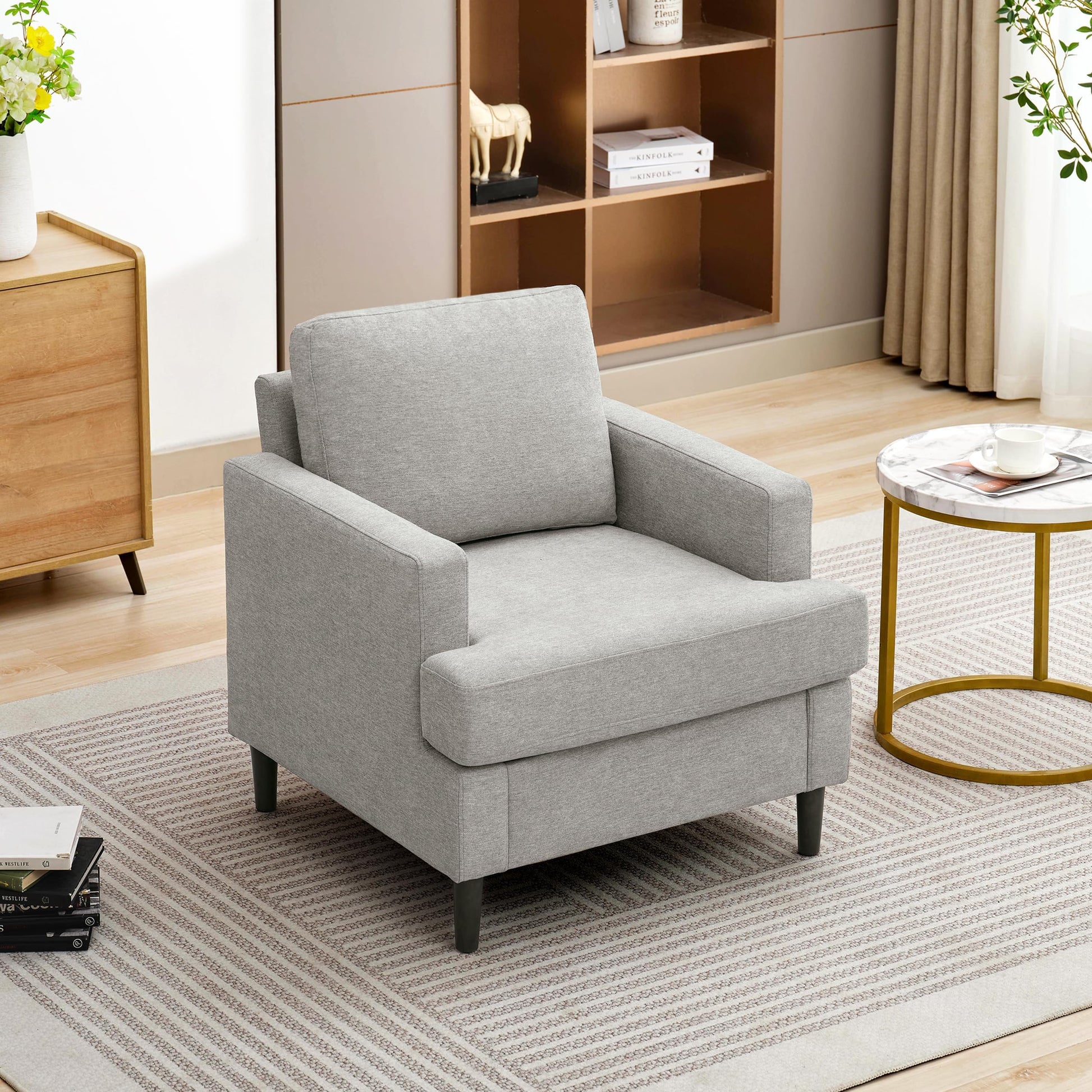 Weture Mid-Century Accent Chair,Modern Linen Fabric Armchair for Living Room,Comfy Upholstered Reading Accent Chairs for Bedroom,Single Sofa Chair with Wood Legs (Light Grey, 1 Pack)